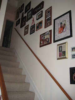 This is our hallway. It used to be blank, but now it is lined with pictures of our family (pre second dog). Michael made different size, shape, and thickness of frames. I painted them to match our living room colors. I told him just to make random sizes, because I didn't want them to fit the pictures perfectly. What I did was arrange different pictures and sayings and squares of scrapbook paper to fit, like a scrapbook page in each frame.